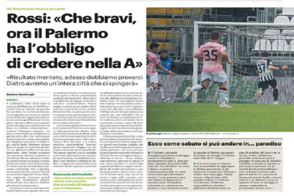 Il tecnico rosanero si è detto soddisfatto dopo il match vinto dai suoi contro l’Ascoli. L’edizione odierna de “Il Giornale di Sicilia” ha analizzato le parole rilasciate ieri da Rossi, che adesso ha l’obbligo di credere nella A. L’allenatore ha commentato così la vittoria sofferta, arrivata nei minuti finali grazie al gol decisivo di Haas: «La vittoria è stata meritata. Se devo commentare nel complesso la partita, devo dire che meritavamo di più nel primo tempo dove abbiamo sbagliato situazioni semplici e gol molto facili. Abbiamo tenuto bene il campo e il controllo del gioco, ma abbiamo sofferto lì davanti sprecando tante buone occasioni che potevano mettere la partita su altri binari. Ma non abbiamo mollato, siamo rimasti sul pezzo e siamo venuti fuori nel corso della partita. C’è anche poi da considerare un discorso caratteriale. Noi ci giochiamo la Serie A diretta, mentre l’Ascoli aveva ormai raggiunto il suo obiettivo stagionale. Avevamo quindi molte più motivazioni rispetto all’Ascoli che non doveva chiedere più niente al campionato».