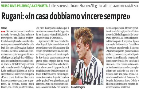 “«Nel suo primo anno come allenatore della Juventus, ha fatto un lavoro meraviglioso»: John Elkann, il presidente della holding Exor che controlla la Juventus, promuove cosi Massimiliano Allegri. E in attesa di festeggiare il quinto scudetto, che ormai soltanto un terremoto sembra poter strappare alla Vecchia Signora, si gode gli «incredibili successi» ottenuti nel primo anno del tecnico livornese. Nella lettera agli azionisti della «cassaforte» della famiglia Agnelli, che ha chiuso il 2015 con un utile inaumento di 421 milioni di euro rispetto all’anno prima, le vittorie bianconere hanno «completato quest’anno impor- tante». La Juventus, ricorda infatti Elkann, che è anche presidente di Fea. «ha vinto il campionato italiano per il quarto anno consecutivo e la Coppa ltalia per la prima volta dal 1995, in più è andato in finale di Champions». A promuovere il tecnico è anche Daniele Rugani, il giocatore rivelazione di quest’ultima parte della stagione: «Ha sempre parlato tanto con me. dicendomi di avere pazienza. di stare tranquillo. Sto vivendo questo momento con grande gioia e orgoglio. Per me è una soddisfazione essere stato scelto dal tecnico meglio in campo». Da baby precario a titolare della formazione che si sta giocando lo scudetto, Rugani è cresciuto anche grazie all’esempio dei compagni di reparto. «Sono tre giocatori straordinari, con caratteristiche che messe insieme compongono il difensore perfetto – dice -: da Barzagli prenderei l’attenzione, da Chiellini l’aggressività e la cattiveria agonistica., da Bonucci la personalità e la capacità di impostare il gioco con un alto livello tecnico». Da tutti loro ha ereditato anche la voglia di vincere: «Mancano sei partite. gli avversari non mollano, ci sono ancora punti a disposizione e siamo chiamati a spingere sull’acceleratore fino alla line – conclude il difensore -. Forse Firenze sarà uno snodo fondamentale. ma anche prima giochiamo due partite in casa che ci potrebbero dare una grande spinta. Cominciamo col battere il Palermo». Per lo sprint la Juventus ritrova Dybala e Khedira. contro i rosanero entrambi dovrebbero iniziare tra i titolari”. Questo quanto scrive l’edizione odierna de “Il Giornale di Sicilia”.