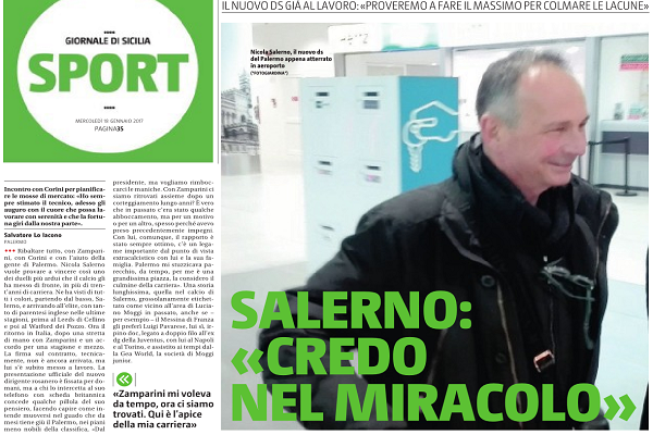 Giornale di Sicilia: “Salerno: «Credo nel miracolo». Il nuovo ds già al lavoro: «Daremo il massimo per colmare le lacune»”