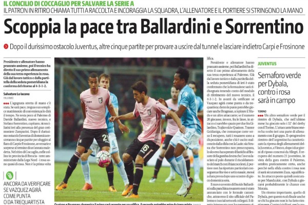 “L’agognata stretta di mano c’è stata. Se sarà pace, tregua o un semplice matrimonio di convenienza lo dirà il tempo. Ne resta poco al Palermo di Davide Ballardini, nuovo tecnico, e Stefano Sorrentino, capitano, riconciliatisi ieri alla presenza del gran cerimoniere Zamparini. Dopo il durissimo ostacolo Juventus di domenica resteranno cinque partite per sfuggire al fiato di Carpi e Frosinone. avversarie e sorprese al termine di un’annata maledetta. Nel ritiro di Coccaglio. nelle colline in provincia di Brescia – terre amministrate dalla lega Nord – i rosa sono quasi di casa. Non è la prima volta che si rifugiano lì, per esorcizzare momenti difficili, fare gruppo e ritrovarsi. Quella attuale è una fase più che complicata, è l’ennesima ripartenza per sperare di uscire da un tunnel in discesa, con vista sulla serie B, l’inferno vis- sato tre stagioni fa. Zamparini, in un discorso alla squadra, ha chiamato tutti a raccolta, chiedendo di mettere da parte egoismi e paure, e di tirare fuori coraggio e attributi per il finale di campionato. Nei giorni scorsi aveva diplomaticamente appianato certe divergenze del passato, avvicinando in particolare le posizioni del nuovo tecnico e di Sorrentino, duellanti a singolar tenzone cinque mesi fa, proprio sul campo di Coccaglio, e poi separati dal repentino esonero dell’allenatore romagnolo, con cui Zamparini aveva assecondato le rimostranze del capitano e di parte dello spogliatoio. Oltre alla querelle con il portiere. nel corso della prima parentesi stagionale di Ballardini c’era stato anche un provvedimento con cui alcuni calciatori erano stati messi fuori rosa: tre – Rigoni. Daprelà ed El Kaoutari – sono stati venduti a gennaio. Il quarto, Maresca, è ancora in organico e, come Sorrentino, ha firmato la pace con il successore di Novellino, mettendo davanti a tutto il bene comune e l’obiettivo della permanenza dei rosa nel massimo campionato. Zamparini si è anche intrattenuto con qualche singolo e ha incoraggiato tutti, a cominciare dal pupillo Vazquez. che domenica ritornerà in campo dopo aver scontato una giornata di squalifica. Presidente e allenatore hanno pranzato assieme, poi Ballardini ha diretto il suo primo allenamento della sua terza esperienza al Palermo. Già dal lavoro tattico e dalla partitella della seduta pomeridiana di ieri è stato confermato che la formazione sarà ridisegnata tenendo conto del modulo di riferimento del nuovo tecnico, il 4-3-1-2. ln avanti da verificare se Vazquez agirà come punta o da trequartista: dietro le punte potrebbe giocare anche Brugman, a ispirare il Mudo e un altro attaccante; se il numero 20 giocasse, invece, fra le linee, in at- tacco ci sarebbe spazio per due fra Gilardino. Trajkovski e Quaison. Tranne Goldaniga, che comunque corre ver- so il recupero, tutti i rosanero sono a disposizione, anche chi è uscito malconcio dalla sfida con la Lazio: sia Struna che Sorrentino non preoccupano, lo sloveno ha superato il fastidio al flessore della gamba destra che l’aveva lasciato al palo durante il riscaldamento del match con i biancocelesti, il portiere non ha riportato particolari conseguenze fra viso e setto nasale, messi a dura prova dopo uno scontro di gioco domenica sera. Il nuovo avvento di Davide Ballardini sulla panchina rosanero non è stato annunciato con le formule canoniche, attraverso il sito ufficiale del Palermo o i social network collegati. ll diretto interessato non ha nemmeno rilasciato dichiarazioni ufficiali e, probabilmente, lo farà soltanto sabato, alla vigilia della sfida con la capolista Juventus. Ancora ieri il Palermo non aveva ufficialmente comunicato l’esonero di Novellino, ma ha semplicemente informato che gli allenamenti sono ripresi agli ordini di Ballardini. Solo un mezzo giallo, comunque, perché la firma del contratto s’è consumata regolarmente ieri pomeriggio, con un accordo fino al termine della stagione, con opzione per la prossima stagione, al di là di come si concluderà questa. Formalizzato in una sezione del portale rosanero il nuovo staff tecnico, con i collaboratori di Ballardini, Ragno. Melandri. Rinaldi e… Tedesco. Il palermitano ed ex centrocampista rosanero, però, si è dimesso, il suo addio è una formalità” . Questo quanto si legge sull’edizione odierna de “Il Giornale di Sicilia”.
