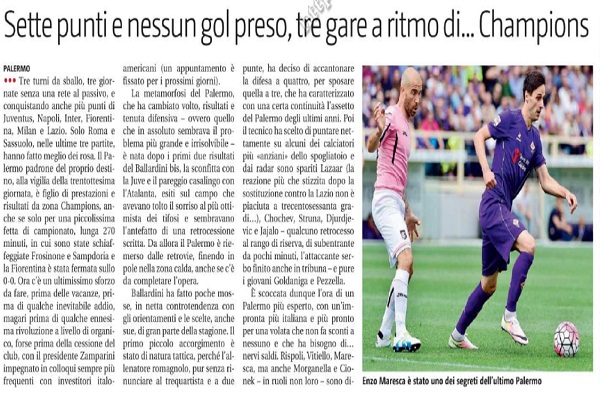 “Tre turni da sballo, tre giornate senza una rete al passivo, e conquistando anche più punti di Juventus. Napoli, Inter, Fiorentina, Milan e Lazio. Solo Roma e Sassuolo, nelle ultime tre partite, hanno fatto meglio dei rosa. Il Palermo padrone del proprio destino, alla vigilia della trentottesima giornata, e figlio di prestazioni e risultati da zona Champions, anche se solo per una piccolissima fetta di campionato, lunga 270 minuti, in cui sono state schiaffeggiate Frosinone e Sampdoria e la Fiorentina e stata fermata sullo 0-0. Ora c’è un ultimissimo sforzo da fare, prima delle vacanze, prima di qualche inevitabile addio, magari prima di qualche ennesima rivoluzione a livello di organico, forse prima della cessione del club, con il presidente Zamparini impegnato in colloqui sempre più frequenti con investitori italoamericani (un appuntamento è fissato per i prossimi giorni). La metamorfosi del Palermo, che ha cambiato volto, risultati e tenuta difensiva – ovvero quello che in assoluto sembrava il problema più grande e irrisolvibile e nata dopo i primi due risultati del Ballardini bis, la sconfitta con la Juve e il pareggio casalingo con l’Atalanta, esiti sul campo che avevano tolto il sorriso al più ottimista dei tifosi e sembravano l’antefatto di una retrocessione scritta. Da allora il Palermo è riemerso dalle retrovie, finendo in pole nella zona calda, anche se c’è da completare l’opera. Ballardini ha l’atto poche mosse, in netta controtendenza con gli orientamenti e le scelte, anche sue, di gran parte della stagione, il primo piccolo accorgimento è stato di natura tattica, perché l’allenatore romagnolo, pur senza rinunciare al trequartista e a due punte ha deciso di accantonare la difesa a quattro, per sposare quella a tre, che ha caratterizzato con una certa continuità l’assetto del Palermo degli ultimi anni. Poi il tecnico ha scelto di puntare nettamente su alcuni dei calciatori più «anziani» dello spogliatoio e dai radar sono spariti Lazaar (la reazione più che stizzito dopo la sostituzione contro la Lazio non è piaciuta a trecentosessanta gradi…). Chochev, Struna. Djurdievic e Jajalo – qualcuno retrocesso al rango di riserva. Di subentrante da pochi minuti, l’attaccante serbo finito anche in tribuna – e pure i giovani Goldaniga e Pezzella. È scoccata dunque l’ora di un Palermo più esperto, con un’impronta più italiana e più pronto per una volata che non fa sconti a nessuno e che ha bisogno di…nervi saldi. Rispoli. Vitiello. Maresca, ma anche Morganella e Cionek, in ruoli non loro – sono diventati gli uomini simbolo della rimonta sul Carpi, dopo che in un paio di mesi era stato fatto a pezzi un largo vantaggio sul biancorossi. Leader riconosciuti, ma anche punti di riferimento silenziosi del gruppo hanno sposato la causa di un’armata da salvare a tutti i costi, nonostante errori macroscopici in campo e fuori. Perlina irrinunciabile è diventato Gilardino, messo in discussione troppe volte, da più tecnici, eppure capocannoniere indiscusso della formazione. L’ex azzurro. in certi momenti, s’è visto superato da DJurdjevic (numeri alla mano, la sfida a distanza del giovane con Belotti è stata persa…) o addirittura da Vazquez nei panni di «falso nueve». La logica ha infine preso il sopravvento. Non solo una questione di curriculum, ma di presenza nell’area di rigore: «Gila» ha ancora l’istinto da bomber ed è un trascinatore positivo. Domenica è a caccia del decimo gol in campionato. E potrebbe diventare il più pesante della stagione”. Questo quanto scrive l’edizione odierna de “Il Giornale di Sicilia”
