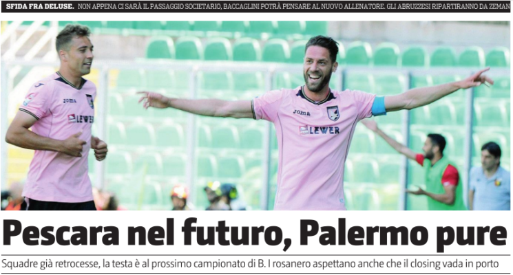 come accadde qualche anno fa con la squadra che centrò la promozione, Immobile, Insigne e Verratti: c’erano loro allora, adesso Zeman proverà a trovarne altri per farli diventare forti come loro. II progetto è avviato, non appena arriveranno i soldi del paracadute e anche quelli di qualche cessione (Caprari), il mercato del Pescara decollerà ed è certa che la prossima stagione gli abruzzesi saranno fra i protagonisti della Serie B. Le stesse ambizioni le ha anche il Palermo, che intanto sta mettendo a punto il passaggio societario da Zamparini a Baccaglini. Pare che l’impasse si sia sbloccata. che il vecchio presidente abbia dato tutti i documenti alla banca londinese che fa da advisor e che la prossima settimana possa esserci il closing. II Palermo in questo momento parte un po’ indietro nella programmazione rispetta all’avversaria di dopodomani, ma ha tutto il tempo per recuperare. Se Baccaglini si affida alle persone giuste, si può accorciare il gap. Di lavoro ce n’è tanto, le scelte dovranno essere fatte in mariera oculata, provando a sbagliare il meno possibile. Di sicuro non bisogna ripetere gli errori delle ultime stagioni, Il Palermo va ricostruita da cima a fondo, Le prime mosse riguarderanno l’area tecnica: si prenderà un direttore sportivo, poi si individuerà l’allenatore. Tutti insieme decideranno chi tenere e chi cedere, e saranno tanti quelli che faranno le valigie. Si ripartirà forse da Rispoli, Gazzi, Henrique, Cionek e da qualche ragazzo. Nestorovski, invece, potrebbe essere sacrificato in nome di una salutare plusvalenza, Nel futuro, quindi, Palermo e Pescara. Anche se prima c’è questa partita che non vale niente”. Questo ciò che si legge sull’edizione odierna de “Il Giornale di Sicilia”.