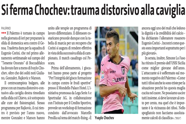 “Il Palermo tornato in campo nella giornata di ieri per preparare la sfida di domenica sera contro il Genoa. Trasferta dura per la squadra di Eugenio Corini, che nel primo allenamento settimanale sul campo del “Tenente Onorato” di Boccadifalco ha dovuto fare a meno di Ivaylo Chochev, oltre che dei soliti noti Giuliano, Gonzalez, Rajkovic e Marson. Il centrocampista bulgaro, alle prese con un trauma distorsivo-contusivo alla caviglia destra rimediato nella sfida col Chievo, si è sottoposto alle cure dei fisioterapisti. Stesso programma per Rajkovic, il cui rientro previsto per l’anno nuovo, mentre Gonzalez e Marson hanno unito alle terapie un programma di lavoro differenziato. Il difensore costaricano procede dunque con la tabella di marcia per un recupero che Corini si augura di rendere effettivo in vista della successiva sfida di campionato, il match casalingo col Pescara. […]”. Questo quanto riportato da “Il Giornale di Sicilia”.