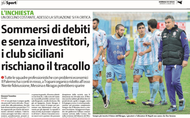 Giornale di Sicilia: “Sommersi di debiti e senza investitori, i club siciliani rischiano il tracollo. Il Palermo ha i conti in rosso, a Trapani organico ridotto all’osso. Messina e Akragas potrebbero sparire”