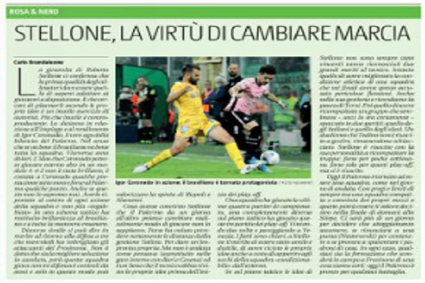 “La giravolta di Roberto Stellone ci conferma che la prima qualità degli allenatori deve essere quella di sapersi adattare ai giocatori a disposizione. E che cercare di plasmarli secondo le proprie idee. E un inutile esercizio di autorità. Più che inutile e controproducente. Lo diciamo in relazione all’impiego e al rendimento di Igor Coronado, il vero ago della bilancia del Palermo. Nel senso che se va bene il brasiliano va bene tutta la squadra. Viceversa sono dolori. L’dea è che Coronado potesse giocare esterno alto in un modulo 4-4-2 non è stata brillante, è costata a Coronado qualche prestazione sotto tono e forse al Palermo qualche punto. Anche se questo non lo sapremo mai. Averlo riportato al centro di ogni azione della squadra e non più «ingabbiato» in uno schema tattico ha restituito brillantezza al brasiliano e a tutta la manovra rosanero. Discorso simile si può dire in merito al ritorno alla difesa a tre che mercoledì ha imbrigliato gli attaccanti del Frosinone. Non è detto che sia la migliore soluzione in assoluto, però questa squadra gioca con tre difensori centrali da anni e solo in questo modo può valorizzare la spinta di Rispoli e Aleesami. […]”. Questa l’analisi de “Il Giornale di Sicilia” in merito al cambio di marcia del Palermo con Roberto Stellone.