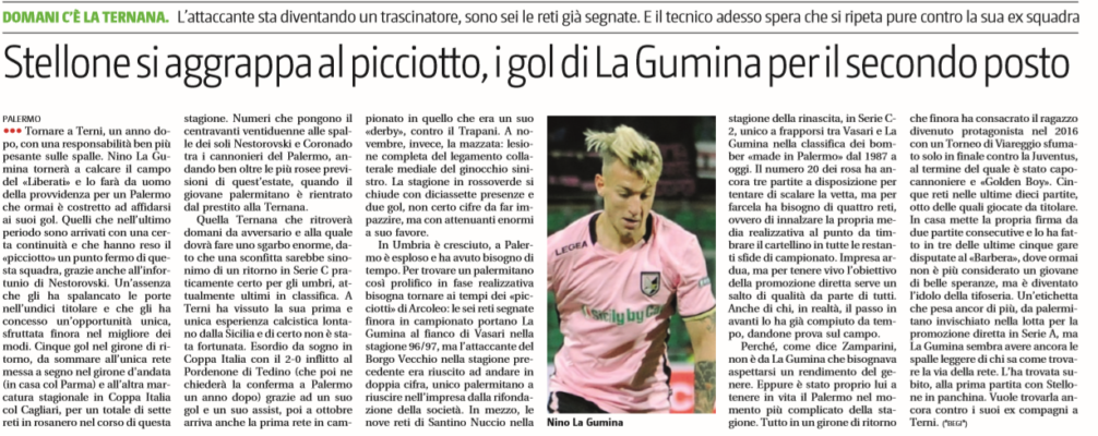“Tornare a Terni, un anno dopo, con una responsabilità ben più pesante sulle spalle. Nino La Gumina tornerà a calcare il campo del «Liberati» e lo farà da uomo della provvidenza per un Palermo che è costretto ad affidarsi ai suoi gol. Quelli che nell’ultimo periodo sono arrivati con una certa continuità e che hanno reso il «picciotto» un punto fermo di questa squadra, grazie anche all’infortunio di Nestorovski. Un’assenza che gli ha spalancato le porte nell’undici titolare e che gli ha concesso un’opportunità unica, sfruttata fin qui nel migliore dei modi. Cinque gol nel girone di ritorno, che va sommata all’unica rete messa a segno nel girone d’andata (in casa col Parma) e all’altra marcatura stagionale in Coppa Italia col Cagliari, per un totale di sette reti in rosanero nel corso di questa stagione. Numeri che pongono il centravanti ventiduenne alle spalle dei soli Nestorovski e Coronado tra i cannonieri del Palermo, andando ben oltre le più rosee previsioni di quest’estate, quando il giovane palermitano è rientrato dal prestito alla Ternana. Quella Ternana che ritroverà domani da avversario e alla quale dovrà fare uno sgarbo enorme, dato che una sconfitta sarebbe sinonimo di un ritorno in Serie C praticamente certo per gli umbri, attualmente ultimi in classifica. A Terni ha vissuto la sua prima e unica esperienza calcistica lontano dalla Sicilia e di certo non è stata fortunata. Esordio da sogno in Coppa Italia con il 2-0 inflitto al Pordenone di Tedino grazie ad un suo gol e un suo assist, poi a ottobre arriva anche la prima rete in campionato in quello che era un suo «derby», contro il Trapani. A novembre, invece, la mazzata: lesione completa del legamento collaterale mediale del ginocchio sinistro. La stagione in rossoverde si chiude con diciassette presenze e due gol, non certo cifre da far impazzire, ma con attenuanti enormi a suo favore. In Umbria è cresciuto, a Palermo è esploso e ha avuto bisogno di tempo. Per trovare un palermitano così prolifico in fase realizzativa bisogna tornare ai tempi dei «picciotti» di Arcoleo: le sei reti segnate finora in campionato portano La Gumina al fianco di Vasari nella stagione 96/97, ma l’attaccante del Borgo Vecchio nella stagione precedente era riuscito ad andare in doppia cifra, unico palermitano a riuscire nell’impresa dalla rifondazione della società. In mezzo, le nove reti di Santino Nuccio nella stagione della rinascita, in Serie C2, unico a frapporsi tra Vasari e La Gumina nella classifica dei bomber «made in Palermo» dal 1987 a oggi. Il numero 20 dei rosa ha ancora tre partite a disposizione per tentare di scalare la vetta, ma per farcela ha bisogno di quattro reti, ovvero di innalzare la propria media realizzativa al punto da timbrare il cartellino in tutte le restanti sfide di campionato. Impresa ardua, ma per tenere vivo l’obiettivo della promozione diretta serve un salto di qualità da parte di tutti. Anche di chi, in realtà, il passo in avanti lo ha già compiuto da tempo, dandone prova sul campo. Perché, come dice Zamparini, non è da La Gumina che bisognava aspettarsi un rendimento del genere. Eppure è stato proprio lui a tenere in vita il Palermo nel momento più complicato della stagione. Tutto in un girone di ritorno che finora ha consacrato il ragazzo divenuto protagonista nel 2016 con un Torneo di Viareggio sfumato solo in finale contro la Juventus, al termine del quale è stato capocannoniere e «Golden Boy». Cinque reti nelle ultime dieci partite, otto delle quali giocate da titolare. In casa mette la propria firma da due partite consecutive e lo ha fatto in tre delle ultime cinque gare disputate al «Barbera», dove ormai non è più considerato un giovane di belle speranze, ma è diventato l’idolo della tifoseria. Un’etichetta che pesa ancor di più, da palermitano invischiato nella lotta per la promozione diretta in Serie A, ma La Gumina sembra avere ancora le spalle leggere di chi sa come trovare la via della rete. L’ha trovata subito, alla prima partita con Stellone in panchina. Vuole trovarla ancora contro i suoi ex compagni a Terni”.