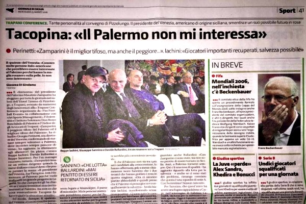 Intervenuto durante la “Trapani conference” il patron del Venezia Tacopina ha così parlato del futuro societario del Palermo. Ecco le sue parole riportate oggi da “Il Giornale di Sicilia”: «Conosco molte persone italo-americane che potrebbero essere interessate al Palermo perché hanno la maglia rosanero sulla pelle. Io non sono interessato per quanto venga volentieri da queste parti e mi senta legato a Montelepre, il paese di mia madre. Ma le persone interessate potrebbero esserci perché Palermo è potenzialmente una realtà molto attraente anche per le grandi potenzialità del pubblico. Classifica un ostacolo? Per assurdo nella convinzione che potrà rialzarsi immediatamente sarebbe più convincente investirvi»