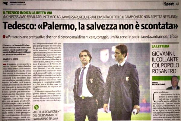 Giornale di Sicilia: “Tedesco indica la retta via: «Non possiamo regalare nulla agli avversari, la salvezza non è scontata»”