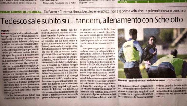 “Primo giorno di scuola a Boccadifalco per Giovanni Tedesco, il tecnico rosanero che si è subito raccordato con Guillermo Barros Schelotto, dirigendo la seduta in vista dell’anticipo di sabato contro il Carpi. Il palermitano è solo l’ultimo «esemplare» di un catalogo di profeti in patria. La lista di tecnici rosanero fatti in casa comprende anche il presidente Raimondo Lanza di Trabia che, nel 1954 affiancò in panchina Massimiliano Varricchio. Altro personaggio mitico che visse un breve interregno sulla panchina fu Carmelo Del Noce il maestro che fece grande la squadra dei cantieri navali negli anni ’70. Dopo il fallimento del 1986/87 il Palermo ripartì dalla Serie C-2 e ottenne la promozione grazie al tecnico Pino Caramanno, palermitano di Piana degli Albanesi. Quasi dieci anni dopo toccò a Ignazio Arcoleo rinverdire la storia del palermitani sulla panchina rosa, con tre campionati e il primo nella memoria di molti per la bravura dei picciotti che infiammarono tifosi di ogni generazione. L’ultimo precursore di Giovanni Tedesco è stato Rosario Pergolizzi che in coppia con Renzo Gobbo fu promosso da Zamparini per succedere Guidolin, che durà solo tre settimane. L’avventura di Tedesco inizia con ben altre aspettative di…vita”.