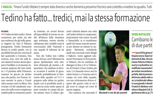 “Tedino ha fatto tredici. Niente scommesse, per carità, ma solo una tendenza che gia nella passata stagione ha visto il Palermo protagonista. Tredici formazioni diverse in tredici partite, con la possibilità ben più che concreta di fare quattordici a Cremona. Una certezza, anzi, visto che sulla fascia sinistra il tecnico dovra riproporre Fiordilino (o al massimo inventarsi qualcosa del tutto inedito) e il prodotto della Primavera rosanero ha giocato da titolare una sola partita, con Posavec (sicuro assente) in porta e Cionek (altro assente certo) in difesa. Una versione 2.0 del camaleonte rosanero che nello scorso campionato cambia pelle in trentasette partite su trentotto, un record dovuto all’impossibilita di trovare un undici all’altezza della situazione ogni settimana, mentre stavolta subentrano altre variabili come le convocazioni delle Nazionali e una sequela di infortuni da far paura. […]”.