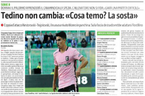 “Squadra che vince non si cambia, o meglio: squadra che non perde non si cambia. Perche il Palermo ha chiuso il 2017 senza mai perdere in trasferta e Tedino spera di poter mantenere vivo questo trend positivo, alla caccia del record di imbattibilità esterna messo a segno da lachini con undici partite di fila senza i noscere sconfitta lontano dal “Barbera”. Domani può arrivare il passo fondamentale per raggiungere quel primato, sul campo di uno Spezia in salute, con un avversario che sarà però, più insidioso dei bianchi liguri: «L’unica cosa che mi preoccupa e vedere la giusta intensità dopo due settimane di sosta». Una pausa lunga, forse troppo per Tedino, che di suo è abituato a lavorare anche durante la pausa, ma che con la squadra deve adesso valutare se la spina è stata prontamente riattaccata: «Durante il lavoro settimanale abbiamo visto la reattivita – ammette il tecnico – ma voglio vedere la bava alla bocca durante la partita. Da capolista abbiamo tutti gli occhi addosso, non possiamo passare per una squadra che gioca sottotono». Un appello a tutti, pur con la fiducia che i suoi giocatori hanno distrato di meritare. infatti si va verso la conferma di tutto quel che si è visto nelle ultime settimane dell’anno da poco conclusosi. Da Coronado mezzala, per cui «l’idea è di continuare su questa strada», alla coppia d’attacco tutta macedone: «Nestorovski e Trajkovski ci hanno dato molto. Ad inizio stagione eravamo partiti con loro due e Coronado, siamo destinati a continuare con questo scacchiere». E Moreo, che fino a pochi giorni fa era stato provato proprio insieme a Nestorovski? «E’ arrivato da poco, ma sono soddisfatto – prosegue Tedino – Ci da comunque la possibilita di variare l’assetto tattico a gara in corso». […]”.