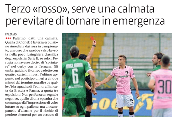 “Palermo, datti una calmata. Quella di Cionek e la terza espulsione rimediata dai rosa in campionato, un rosso che sarebbe valso la vetta nella poco lusinghiera classifica degli espulsi in Serie B, se solo il Perugia non avesse deciso di “sprintare” nel derby con la Ternana. Gli umbri guidano il torneo cadetto con quattro cartellini rossi, l’ultimo appunto nel posticipo di ieri a cinque minuti dal termine, ma alle sue spalle c’è la squadra di Tedino, affiancata da Brescia e Parma, a quota tre espulsioni. Non per forza un segnale negativo, quello di una squadra che comunque dà l’impressione di voler lottare su ogni pallone, ma un campanello d’allarme per il rischio di perdere elementi per un eccesso di cattiveria. Un pericolo da evitare, dato che l’emergenza è sempre dietro l’angolo, e che sabato prossimo costringera il tecnico a schierare una difesa pressochè obbligata dovendo fare a meno di Cionek. Il polacco, allontanato dall’arbitro prima del termine della prima frazione di Avellino-Palermo, non lascia grandi opportunità di scelta nel reparto arretrato per il match col Venezia. […]”.