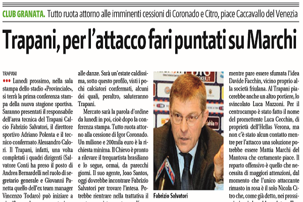 mentre pare essere sfumata l’idea Davide Facchin, vicino proprio alla società friulana. Al Trapani piacerebbe anche un altro portiere, lo svincolato Luca Mazzoni. Per il centrocampo è stato fatto il nome del promettente Luca Cecchin, di proprietà dell’Hellas Verona, ma non c’è stato alcun contatto mentre per l’attacco una soluzione potrebbe essere Mattia Marchi del Mantova che certamente piace. Il reparto offensivo è quello che necessita di maggiori attenzioni, dal momento che l’unico attaccante rimasto in rosa è il solo Nicola Citro che, come già detto, nei prossimi giorni dovrebbe salutare Trapani. Un nome nuovo è rimbalzato ieri sera, si tratta dell’attaccante Giuseppe Caccavallo del Venezia. Da valutare anche la possibilità di rinnovo di Curiale, il cui contratto scadrà oggi, e il ritorno del trapanese Adriano Montalto”.1Questo quanto riportato da “Il Giornale di Sicilia”.