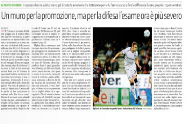 “Il Palermo si presenta all’ultima spiaggia con la miglior difesa dei playoff e la certezza di poter contare su un reparto solido. Servirà, e anche tanto, se si pensa anche solo ai risultati della passata edizione: due 0-0, tre 1-0 e un solo 1-1 in sei partite disputate tra semifinali e finale. Non aspettatevi festival del gol, dunque, e il Palermo da questo punto di vista parte col vantaggio di una retroguardia ritrovata dopo le titubanze di un mese fa. Tolte le distrazioni nei minuti finali con la Ternana, la squadra di Stellone ha ritrovato la sicurezza che mancava in fase di copertura, terminando il torneo con zero gol subiti nelle ultime due partite. Non solo, di pericoli reali creati da Salernitana e Cesena nelle partite di fine campionato si contano nelle dita di una mano. Merito di avversari senza stimoli? Anche, ma guai a sottovalutare un reparto che ha chiuso col secondo miglior risultato per quanto riguarda le reti subite. Meglio ha fatto solo il Parma, con 37 reti sul groppone. Il Palermo, con 39, può comunque vantare la miglior retroguardia tra le sei squadre che si giocheranno l’ultimo posto in A tramite i playoff. […]”.
