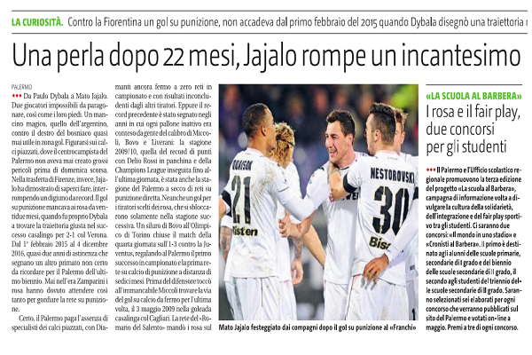 “Da Paulo Dybala a Mato Jajalo. Due giocatori impossibili da paragonare, cosi come i loro piedi. Un mancino magico, quello dell ‘argentino, contro il destro del bosniaco quasi mai utile in zona gol. Figurarsi sui calci piazzati, dove il centrocampista del Palermo non aveva mai creato grossi pericoli prima di domenica scorsa. Nella trasferta di Firenze, invece, Jajalo ha dimostrato di saperci fare, interrompendo un digiuno da record. Il gol su punizione mancava ai rosa da ventidue mesi, quando fu proprio Dybala a trovare la traiettoria giusta nel successo casalingo per 2-1 col Verona. Dal l’ febbraio 2015 al 4 dicembre 2016, quasi due anni di astinenza che segnano un altro primato non certo da ricordare per il Palerrno dell’ultimo biennio. Mai nell’era Zamparini i rosa hanno dovuto attendere cosi tanto per gonfiare la rete su punizione. Certo, il Palermo paga l’assenza di specialisti dei calci piazzati, con Diamanti ancora fermo a zero reti in campionato e con risultati inconcludenti dagli altri tiratori. Eppure il record precedente stato segnato negli anni in cui ogni pallone inattivo era conteso da gente del calibro di Miccoli, Bovo e Liverani: la stagione 2009/10, quella del record di punti con Delio Rossi in panchina e della Champions League inseguita fino all’ultima giornata, stata anche la stagione del Palermo a secco di reti su punizione diretta. Neanche un gol per i tiratori scelti dei rosa, che si sbloccarono solamente nella stagione successiva. Un siluro di Bovo all’Olimpico di Torino chiuse il match della quarta giornata sull’ I -3 contro la Juventus, regalando al Palermo il primo successo in campionato e la prima rete su calcio di punizione a distanza di sedici mesi. Prima del difensore toccò all’immancabile Miccoli trovare la via del gol su calcio da fermo per l’ ultima volta, il 3 maggio 2009 nella goleada casalinga col Cagliari. La rete del «Romario del Salento» mandò i rosa sul momentaneo 2-0, in una partita conclusa con un netto 5-1. Quarantacinque giornate di digiuno complessive, sorpassate giä nella passata stagione, quando alle diciassette giornate senza reti su punizione del campionato 2014/ 15 si andarono a sommare tutte e trentotto le partite dell’anno scorso. Un filotto allungato a ben sessantanove partite di astinenza su calcio piazzato, prima che Jajalo trovasse la gemma del momentaneo 1-1 sul campo della Fiorentina. Una rete che non è bastata a portare a casa la vittoria e ad interrompere un digiuno di punti lungo ormai Otto giornate, ma che almeno ha interrotto un incantesimo al quale ormai tutti avevano fatto l’abitudine. E in attesa che si sblocchi Diamanti, primo nella gerarchia dei battitori per quanto riguarda le punizioni, Corini puö contare anche sul mediano bosniaco. Che per molti sarà anche una sorpresa, eppure sui calci piazzati ha dimostrato anche nel corso del precampionato di poter essere un’alternativa credibile. E ora accanto ha anche un maestro della specialità, Corini appunto, che potrà dargli qualche consiglio in più”. Questo quanto si legge su “Il Giornale di Sicilia”.