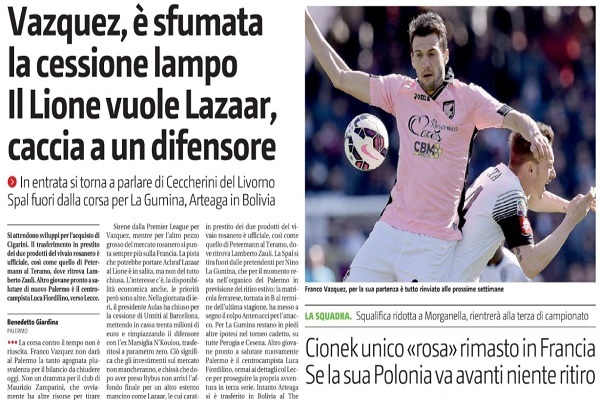 Giornale di Sicilia: “Vazquez, è sfumata la cessione lampo. Il Lione vuole Lazaar…”