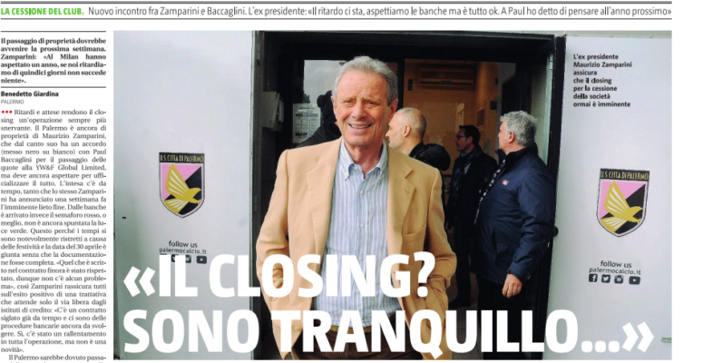 “Ritardi e attese rendono il closing un’operazione sempre più snervante. II Palermo è ancora di proprietà di Maurizio Zamparini. che dal canto suo ha un accordo (messo nero su biancol con Paul Baccaglini per il passaggio delle quote alla YW&F Global Limited, ma deve ancora aspettare per ufficializzare il tutto. L’intesa c’è da tempo, tanto che lo stesso Zamparini ha annunciato una settimana fa l’imminente lieto fine. Dalle banche è arrivato invece il semaforo rosso, o meglio, non ancora spuntata la luce verde. Questo perché i tempi si sono notevolmente ristretti a causa delle festività e la data del 30 aprile è giunta senza che la documentazione fosse completa. «Quel che è scritto nel contratto finora è stato rispettato, dunque non c’è alcun problema. Cosi Zamparini rassicura tutti sull’esito positivo di una trattativa che attende solo il via libera dagli istituti di credito: «C’è un contratto siglato già da tempo e ci sono delle procedure bancarie ancora da svolgere, Si, c’è stato un rallentamento in tutta l’operazione, ma non è una novità». II Palermo sarebbe dovuto passare dalle mani di Zamparini a quelle di Baccaglini lo scorso 30 aprile. Le parti hanno convenuto di far slittare il closing di una settimana, dunque al 7, che essendo però una domenica porta automaticamente la nuova data decisiva a lunedì prossimo. Con ogni probabilità, invece, si dovrà spostare ancora di qualche giorno il termine utile per la conclusione dell’affare. Oggi è l’ultimo giorno della settimana in cui sarà possibile compiere la transazione, ma non ci sono segnali per una chiusura immediata. Per questo è ormai certo che l’operazione verrà ripresa la prossima settimana, con la speranza di chiuderla prima del prossimo week end: «Non è successo nulla, prosegue Zamparini. Avevamo preventivato una data per la chiusura delle trattative, ma i tempi per le garanzie bancarie e tutte le procedure si sono rivelati un po’ più lunghi, dunque abbiamo dovuto far slittare il tutto. Ma non c’è assolutamente nessun problema, siamo quasi arrivati alla conclusione». Quel “quasi” non lascia ben sperare, dato che di trattative del genere in tempi recenti se ne sono viste già troppe. Su tutte quella che ha segnato l’addio di Silvio Berlusconi al Milan, dopo un anno di negoziati con la cordata cinese guidata da Yonghong Li e di rinvii a suon di caparre milionarie. La situazione del Palermo però è diversa. In primis proprio per le tempistiche che lo stesso Zamparini considera decisamente più brevi: «Se Berlusconi ha avuto un rallentamento di un anno per la cessione del Milan, perché mai dovrebbe essere un problema ritardare l’operazione nostra di un massimo di quindici giorni? Credo che già la settimana prossima ci sarà il passaggio di proprietà delle quote». Almeno altri sette giorni, dunque, poi si vedrà il da farsi. L’unica garanzia Concessa ai tifosi? La solita. Ovvero che tra Zamparini e Baccaglini finora tutto fila liscio come l’olio. Anzi, l’ex presidente sottolinea come da parte sua ci sia la più totale serenità per una conclusione positiva delle trattative: «Quello che si deve preoccupare sono io, mica voi (ride, ndr). Se sono tranquillo io, allora non c’è nulla da temere». La fiducia non manca, anche se i tifosi attendono con impazienza l’ufficialità del nuovo corso. Perché per il momento l’azionista unico del Palermo rimane Zamparini e per questo è necessario che Baccaglini si insedi il prima possibile da patron, non solo da presidente. Perché fra tre settimane termina il campionato e bisognerà iniziare a pianificare la prossima stagione: «Sicuramente sarà tutto pronto entro la fine del campionato conclude Zamparini . Oggi (ieri, ndr) ho incontrato Baccaglini proprio per questo, perché lui deve preoccuparsi già adesso di pianificare il budget in vista della prossima stagione. Se fossi rimasto io avrei avuto un mio budget. Siccome lui deve pensare a riconquistare subito la Serie A, allora dovrà rinforzare la squadra proprio come ho fatto io quando ho preso il
