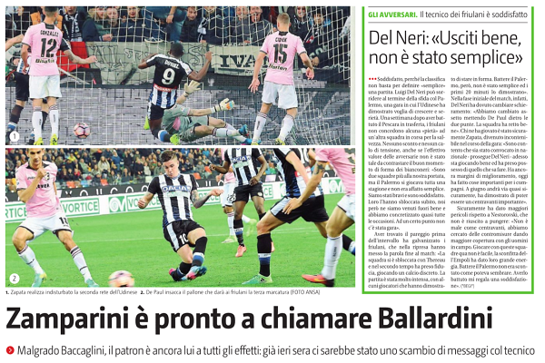 “Sconfitte del genere, in altri tempi, avrebbero sollevato dubbi sulla permanenza di Diego Lopez. E se i vecchi tempi in realtà non fossero mai finiti? Perché Maurizio Zamparini starebbe pensando all’ennesimo cambio in panchina e nessuno glielo vieta, essendo il proprietario effettivo della società fino al prossimo 30 aprile. Una scelta che implicherebbe non poche storture, in primis quella della fiducia accordata alI’allenatore uruguaiano sin dal momento della firma. Lopez giunto a Palermo siglando un contratto di diciotto mesi, con I’evidente intenzione di proseguire con lui il progetto per un’eventuale risalita dalla Serie B e non semplicemente per tentare il possibile nella rimonta verso la salvezza. Una fiducia che dal 26 gennaio, data in cui ha firmato il contratto con i rosa, di fatto iniziata a diminuire. Zamparini si è fatto sentire già dopo la sconfitta casalinga con la Roma, la prima partita da ex presidente del Palermo, e non avrebbe affatto gradito quanto visto contro I’Udinese. L’ennesimo ko dei rosa ha fatto scattare nella mente del patron I’idea di cambiare per I’ennesima volta guida tecnica. Uno scambio di messaggi con Davide Ballardini, allenatore del Palermo durante la preparazione estiva e nelle prime due partite di campionato, per valutare se dare o meno un’ulteriore svolta ad una squadra ormai distante dalI’obiettivo salvezza. Non certo la prima volta che Zamparini provi a riportare in Sicilia l’allenatore romagnolo, dimessosi dopo la trasferta di Milano con I’Inter e più volte contattato dal presidente nel tentativo di fargli cambiare idea. L’ultima, poco prima di convincersi a mettere Lopez sulla panchina rosanero. In quel mese in cui Eugenio Corini è stato sfiduciato praticamente ogni settimana, anche Ballardini rientrato nel novero dei tecnici rivalutati da Zamparini, con un «no, grazie» come risposta all’avvicinamento. A due mesi di distanza, scattato un nuovo contatto. L’uscita di scena in favore di Paul Baccaglini nel ruolo di presidente non ha certo esautorato Zamparini dal prendere decisioni, cosa che gli spetterà fino alla cessione definitiva del pacchetto di maggioranza del club e che potrebbe non essergli negata anche al termine dell’affare, soprattutto se il nuovo presidente intenderà concedergli un posto in società come consulente. Se questa «carica» venisse ricoperta da Zamparini già adesso, potremmo dire che il suo primo «consiglio» sarebbe quello di pensare ad una nuova guida tecnica per questa squadra, nel tentativo di rincorrere un miracolo sportivo. Un po’ come accadde nella passata stagione, quando Ballardini rientrò al comando della nave rosanero con sei giornate da disputare, ma trovandosi a pari punti con il Carpi nella corsa al quartultimo posto. Una situazione difficile, ma non certo paragonabile a quella attuale, con I’Empoli distante sette punti a dispetto di una serie negativa che vede i toscani a secco da sei partite di fila. Sei partite in cui l’Empoli non ha saputo centrare la fuga, ma anche sei partite in cui il Palermo ha ridotto il gap solamente di un punto. Troppo poco per poter alimentare le speranze di rimonta e quanto basta per accantonare le prime due partite con Lopez in panchina, in cui sono arrivati quattro punti e le illusioni di salvezza sono improvvisamente rinate. Un fuoco di paglia che oggi tiene il Palermo bloccato in piena zona retrocessione e che ha fatto venire i primi dubbi da ex presidente a Zamparini. Quelli che adesso mettono sulla graticola anche Lopez e che possono riportare Ballardini in rosanero, che dal canto suo aveva in pro- gramma una visita a Palermo proprio fra oggi e domani per motivi personali. E chissà che non resti…”. Questo quanto riportato da “Il Giornale di Sicilia”.