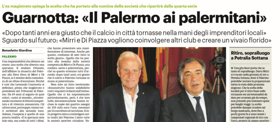 Nell’edizione odierna del “Giornale di Sicilia”, il giudice Leonardo Guarnotta, tifoso rosanero di vecchia data che ha affiancato Orlando nella scelta della nuova proprietà del Palermo, ha parlato degli ultimi anni del club rosanero: «I tifosi non meritavano queste umiliazioni, per l’amore mostrato verso questi colori unici al mondo». E Guarnotta, che ha visto il Palermo toccare più volte il fondo, sa bene cosa significhi: «Andai la prima volta allo stadio a dieci anni, sono rimasto estasiato da Sukru, questo giocatore imponente che segnò direttamente da calcio d’angolo. Ma non solo questo: sono stato uno dei quaranta di Palermo-Chievo del 1997, ho vissuto tutte e tre le finali di Coppa Italia e soprattutto il dramma della retrocessione in C2 sventata solo dalla mancata iscrizione dell’Ischia Isola verde». Oltre al fallimento del 1986, « Un’altra umiliazione» che però non è paragonabile alla situazione attuale: «Abbiamo appena vissuto la fase più nera e i tifosi sono stati presi in giro, ma ora il Palermo torna ai palermitani».