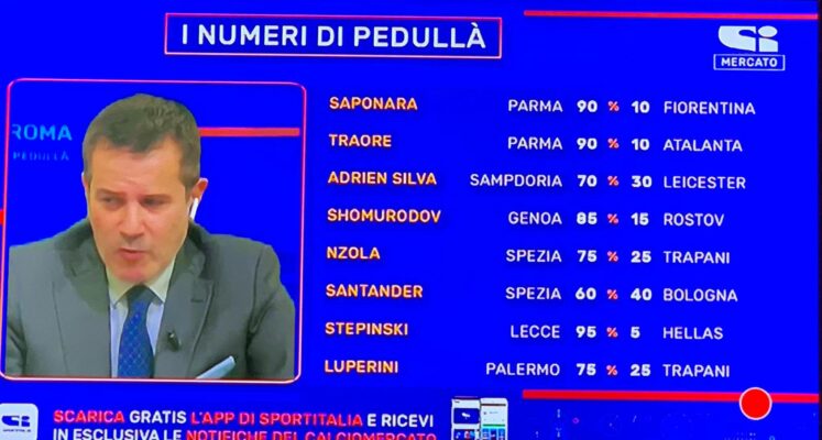 In onda nella consueta trasmissione serale di Sportitalia, il noto giornalista Alfredo Pedullà ha “dato” le sue percentuali in merito alle ultime trattative di calciomercato. Tra queste, emerge la posizione di Luperini: al 75% il suo futuro sarà a Palermo, al 25% a Trapani, come si evince in foto.