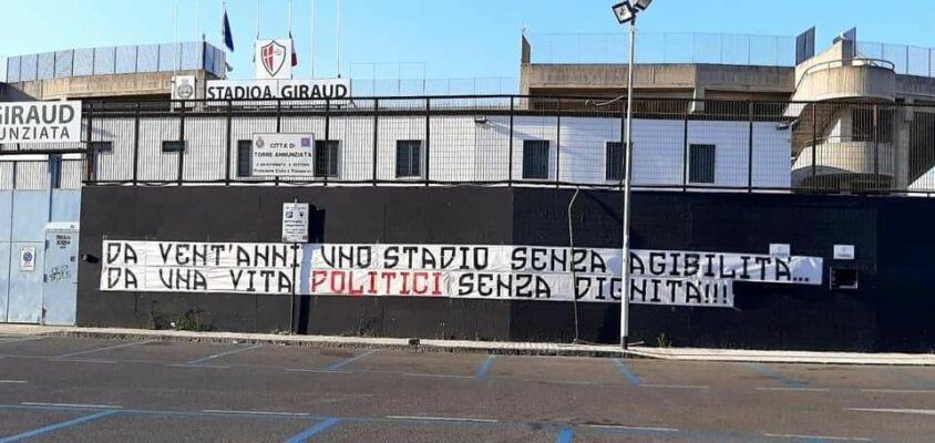 La situazione di stallo che si sta vivendo a Torre Annunziata da almeno un mese, ha fatto perdere la pazienza ai tifosi del Savoia, che attendono novità in merito alla questione stadio. I lavori al Giraud sono indispensabili se si vuole ottenere il ripescaggio in Lega Pro, ma siamo già arrivati al mese di luglio e i lavori non sono inziati. I tifosi del Savoia hanno quindi deciso di manifestare tutto il loro il malcontento con uno striscione che recita: “Da vent’anni uno stadio senza agibilità… Da una vita politici senza dignità”. In alto la foto in questione.