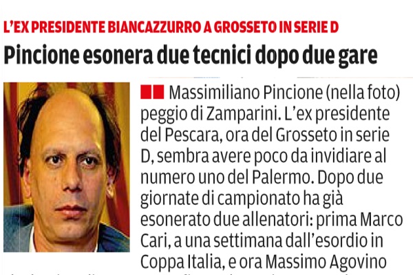 “Massimiliano Pincione peggio di Zamparini. L’ex presidente del Pescara, ora del Grosseto in serie D, sembra avere poco da invidiare al numero uno del Palermo. Dopo due giornate di campionato ha già esonerato due allenatori: prima Marco Cari, a una settimana dall’esordio in Coppa Italia, e ora Massimo Agovino che ha rimediato una sconfitta col Sestri Levante. Il nuovo avvicendamento dovrebbe portare sulla panchina dei maremmani l’ex tecnico Torres, Marco Sanna”. Questo quanto scrive l’edizione odierna de “Il Centro”.