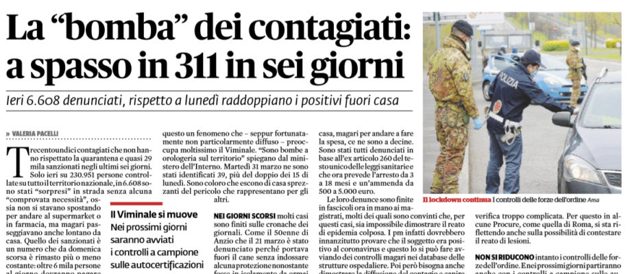 Il Fatto Quotidiano: “Italia. La “bomba” dei contagiati: a spasso in 311 in sei giorni. Il Viminale si muove. Nei prossimi giorni saranno avviati i controlli a campione sulle autocertificazioni”