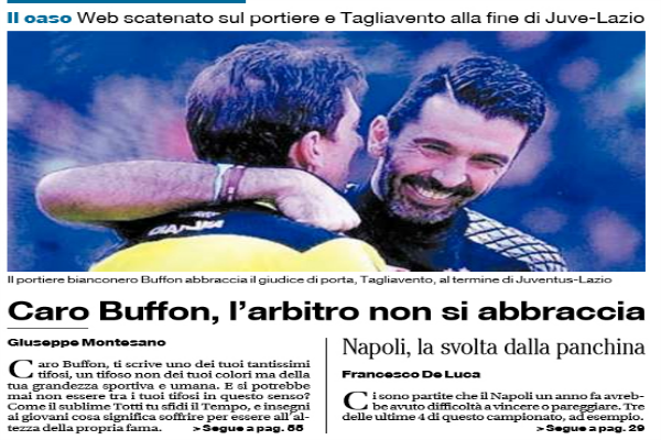 “Al termine della partita Juventus – Lazio, giocata ieri allo Juventus Stadium e vinta dalla formazione bianconera, Gigi Buffon si è lasciato andare in un abbraccio con l’arbitro del match Paolo Tagliavento. Questo gesto, effettuato dal portiere della Juventus, non è passato inosservato e vi sono state numerose reazioni sul web. Un tifoso ha scritto una lettera aperta a Buffon inviandola a Il Mattino di Napoli ed il quotidiano l’ha pubblicata: ”Caro Buffon, ti scrive uno dei tuoi tantissimi tifosi, un tifoso non dei tuoi colori ma della tua grandezza sportiva e umana. E si potrebbe mai non essere tra i tuoi tifosi in questo senso? Come il sublime Totti tu sfidi il Tempo, e insegni ai giovani cosa significa soffrire per essere all’altezza della propria fama. Come pochissimi altri calciatori tu sei quello che, in un Paese rissoso e livoroso, va ad abbracciare gli avversari anche quando quegli avversari ti hanno fatto mordere l’erba; tu sei il simbolo intramontabile dell’agonismo buono, e incarni le doti cavalleresche della sportività. E allora, caro e grande Buffon, potresti dirmi perché alla fine della partita vinta con merito contro la Lazio sei andato ad abbracciare l’«addizionale», ovvero il giudice di porta, il signor Tagliavento? Sai, caro Buffon, tu per quanto mi riguarda sei liberissimo di abbracciare qualsiasi cosa, anche il palo della porta o la panchina o il secchio dell’acqua: ma quell’abbraccio a un arbitro è risuonato come una piccola stonatura in una bella sinfonia. Sto esagerando? Potrebbe darsi, certo, ma pensaci un momento: forse che in un dibattimento in aula tra due parti che si scontrano davanti a un magistrato accade che, alla fine del dibattimento, una delle due parti vada ad abbracciare il magistrato che è stato super partes a regolare lo scontro tra le parti? So che sei un uomo serio e integro, e so che ti sembrerebbe strano un abbraccio del genere: sono sicuro che lo capisci. Ma gli arbitri in una partita hanno un po’ il ruolo di un magistrato in un dibattimento: non ti pare? E devo sussurrarti in un orecchio che le parti, dopo i dibattimenti, non abbracciano nemmeno i giudici popolari, e men che mai i giudici di pace, a meno che non siano irresistibilmente attratti dal sex appeal di giurati e giudici di pace! Sono sottigliezze, dirai, e nessuna legge vieta di abbracciare il giudice di porta alla fine di una partita: certo, caro Buffon, ma tu sai bene che il galateo sportivo non è fatto solo di leggi scritte, ma anche di piccole e grandi leggi non scritte. Insomma, a dirtela con il candore dei tanti tifosi della tua grandezza sportiva, noi non capiamo quell’abbraccio. Dicci, Gran Portiere: è stato un gesto di affetto incontrollabile e inconscio in cui manifestavi la riconoscenza verso il Mondo intero dopo una settimana difficile per la tua squadra? E’ stato il gesto di un Nobile Feudatario che, facendo parte dell’Impero calcistico più ricco d’Italia e fra i più ricchi del mondo, si china su un piccolo «addizionale» come un imperatore che manifesta affetto a un suo valvassino? Sai, caro Buffon, questo è un Paese incredibilmente fazioso, e da quando esistono i social, anche in preda al vaniloquio: e sui social molti si sono scatenati a leggere nel tuo gesto chissà quali sottintesi, e sottotesti, e sottotutto, avanzando sospetti su fatti che ormai appartengono al passato e sono certo privi di fondamento. Sbagliano costoro? Certo che sbagliano! Ma allora, caro Buffon, perché mai quel gesto in cui una delle parti è andata ad abbracciare uno dei giudici in campo, o, se proprio non vuoi qualificare il giudice di porta come giudice, lo scrivano o l’usciere degli altri tre giudici? Lo so, lo sappiamo, è stato uno scivolone piccolissimo, ma quando si è un campione così grande allora anche i mini-scivoloni suonano bruttini, sai. E allora, salutandoti con immutato affetto e stima, ti diamo un modesto suggerimento: la prossima volta, per manifestare la tua gioia sportiva, stampa un classico bacio alla francese o come ti pare sulla sfera di cuoio. Quella è davvero rotonda, e non arbitra le partite”.