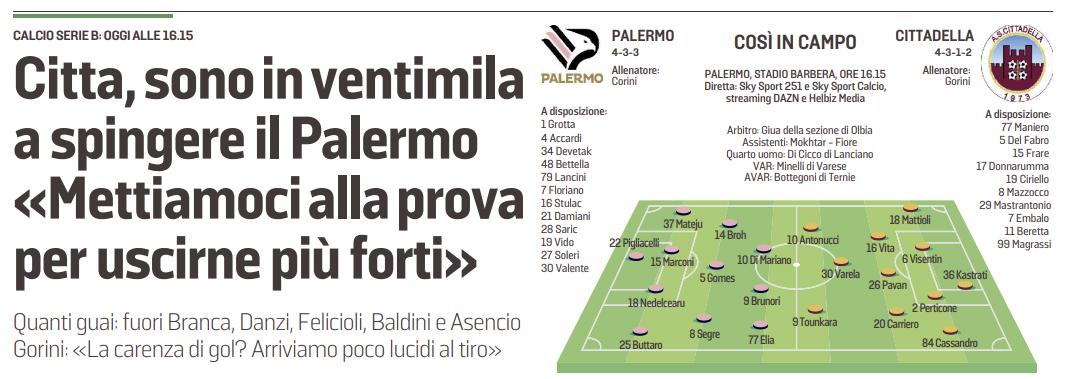 L’edizione odierna de “Il Mattino” riporta le parole di Gorini in vista di Palermo-Cittadella.
