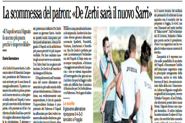 Il Mattino: “La scommessa del patron: «De Zerbi sarà il nuovo Sarri. Il Napoli senza Higuain fa ancora più paura perché è imprevedibile»”