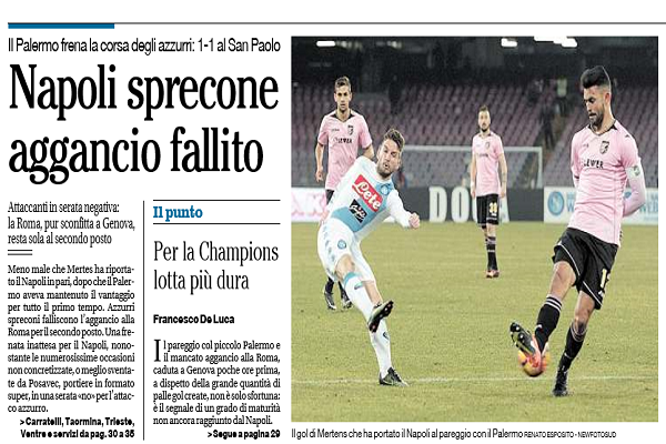 “Il Napoli spreca l’occasione di agguantare la Roma al secondo posto. Gli azzurri vengono bloccati dal Palermo che gioca la partita della vita e esce indenne al San Paolo. […] Il Napoli trova un Palermo tonico e rigenerato dal cambio di allenatore che costruisce la sua partita sul gol a freddo accentuando la tattica difensiva con falli a ripetizione e perdite di tempo sistematiche. E soprattutto trova un Posavec formato super che commette un’ingenuità sulla rete di Mertens ma compie in totale sei grandi parate, un paio davvero fenomenali. […]”. Questa una parte dell’analisi condotta da “Il Mattino” in merito a Napoli-Palermo”