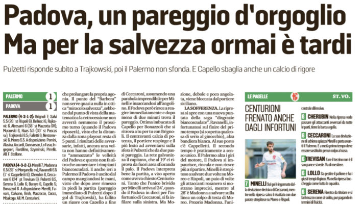 L’edizione odierna de “Il Mattino” analizza il pareggio tra Palermo e Padova. Il punto non serve ai veneti per un miracolo salvezza. Anche ieri, il Padova è uscito da Palermo mangiandosi le mani, dopo aver fallito il rigore con Capello. Dopo l’iniziale vantaggio rosanero siglato da Trajkovski, i biancoscudati sono stati abili a ristabilire la parità con Pulzetti. Nella ripresa, il Padova viene messo alle corde dal Palermo. Minelli è strepitoso a salvare due volte su Moreo e Rispoli. Tuttavia, i rosanero sono poco precisi e vanificano il proprio assalto finale. Tanti rimpianti anche per il Padova.
