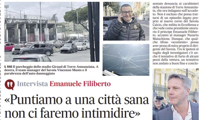 LE IPOTESI Intanto, il team manager ha presentato denuncia ai carabinieri della stazione di Torre Annunziata, che ora indagano sull’accaduto. Non è escluso che possa trattarsi di un episodio legato proprio al nuovo corso del Savoia Calcio, che milita in Eccellenza e che vede come presidente onorario il principe Emanuele Filiberto, accanto al manager Nazario Matachione. Dunque, che qualche tifoso «scontento» possa aver preso di mira proprio il dirigente del Savoia. Tra le ipotesi al vaglio degli investigatori c’è anche il tentativo di furto di alcuni pezzi della vettura, un tentativo non andato a buon fine e concluso con il danneggiamento della vettura. Ma è possibile che si tratti di un «dispetto», visto che l’unica auto danneggiata è proprio quella di Musto. Tra le ipotesi al vaglio c’è anche quella del raid di uno dei parcheggiatori abusivi che solitamente presidiano la zona. A rendere noto e denunciare l’episodio è stato ieri proprio il principe Emanuele Filiberto che si dice sicuro che «le forze dell’ordine sapranno attivarsi in uno sforzo investigativo teso a fare chiarezza sull’odiosa vicenda e ad assicurare alla giustizia gli autori del reato». Ieri pomeriggio, il team manager era allo stadio Giraud per la ripresa degli allenamenti della squadra. Vincenzo Musto, infatti, è tra i più stretti collaboratori di Nazario Matachione, che è tra i componenti della cordata di imprenditori che ha rilevato il club, dopo l’addio della vecchia proprietà, in seguito al terremoto giudiziario che ha coinvolto anche l’ex direttore sportivo Felicio Ferraro, finito in carcere per presunti legami con il clan Gionta.