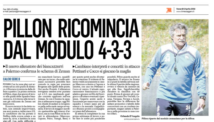 “Con la zona play-out arrivata ad un solo punto di distacco, il Pescara ricomincia dalla difesa a quattro. La prima certezza di Pillon, dopo due giorni di lavoro alla guida della squadra biancazzurra, è il ritorno alla terza linea già utilizzata da Zeman nei mesi scorsi. Il nuovo tecnico lo ha detto subito, non intende improvvisare, ma anzi punta a riallacciare il filo conduttore che ha portato il Delfino dalla scorsa estate a un mese fa, circa, a lambire la zona play-off. Con mille difficoltà e senza mai incantare, quando in panchina c’era il boemo, ma con una coerenza tattica che garantisce, a nove turni dalla fine del campionato, qualche certezza per Fiorillo e compagni. Logico che il primo lavoro del 62enne trevigiano oggi è psicologico: il Pescara è una squadra senza una sua forte identità, senza giocatori carismatici in mezzo al campo (il più rappresentativo, Campagnaro, è infortunato) e adesso anche impaurita dal rischio concreto di scivolare in piena zona retrocessione. Tatticamente, quindi, Pillon vuole aggiungere solo qualche pillola della sua idea di calcio per ritrovare quello che più serve al momento ai biancazzurri: il risultato. Il ritorno alla linea a quattro dietro, sperando di poter impiegare ancora per qualche partita gli esperti del gruppo (sia Bovo che Campagnaro sono fuori al momento), dovrebbe essere la base per dare solidità alla squadra. Fiamozzi candidato alla prima da titolare in questa stagione sulla destra, Crescenzi a sinistra: sono loro i candidati a prendere posto sulle fasce, considerando che Mazzotta è infortunato e Balzano ha giocato le ultime partite senza mai rifiatare, e che l’altra alternativa è il 2000 Elizalde, adattato al ruolo essendo un centrale. In mezzo al campo, il punto interrogativo di queste ore è legato a Brugman: il play della squadra resta il capitano, con Valzania e, probabilmente, Coulibaly interni in grado di dare fisicità e forza. Machin al momento è candidato a debuttare in mezzo al campo al posto di Brugman, se l’uruguaiano non dovesse recuperare in tempo per domani pomeriggio. L’ex bresciano è l’unico giocatore disponibile visto che a Palermo mancherà Carraro, squalificato per un turno, che nelle settimane successive potrebbe fare comodo in regia per avanzare Brugman alle spalle delle punte. Out anche Proietti. L’allenatore trevigiano sembra aver puntato sul 4-3-3, ma cambiando qualche concetto applicato nell’era Zeman. Se con il boemo la squadra si abbassava troppo, oggi Pillon chiede di andare a recuperare palla nella metà campo avversaria. Il lavoro di maggior sacrificio spetterebbe agli esterni d’attacco, ma in rosa Pillon ne ha trovati in abbondanza (Mancuso, Capone, Falco, Yamga, Baez) e per questo potrà anche sfruttarne la rotazione. Il tridente di Palermo vedrà sicuramente in campo Mancuso a destra e Capone a sinistra, con uno tra Pettinari e Cocco al centro. L’attuale capocannoniere biancazzurro è più adatto a giocare sul filo del fuorigioco e sfruttare eventuali ripartenze, l’esperto ariete sardo è funzionale per manovrare con la squadra e creare spazi per gli esterni o la mezzala. Cappelluzzo e Bunino pronti a scompigliare i piani dell’allenatore. In attesa di completare la sua prima settimana di lavoro e poter fare le scelte più ponderatepossibili, Pillon guarda anche al calendario. Il tecnico ha fissato in 12 punti la tabella salvezza nelle ultime 9 partite della stagione, ovvero 4 vittorie da centrare da qui alla fine. Significherebbe chiudere in classifica con 49 punti. Prima di giocare gli scontri diretti contro Pro Vercelli, Cesena, Ternana, Novara e Ascoli, potrebbe fare la differenza far saltare pronostici e tabelle delle concorrenti con un risultato importante, magari sabato a Palermoe nella prossima in casa contro il Bari”. Questo il punto in casa Pescara riportato dall’edizione odierna de “Il Messaggero”.