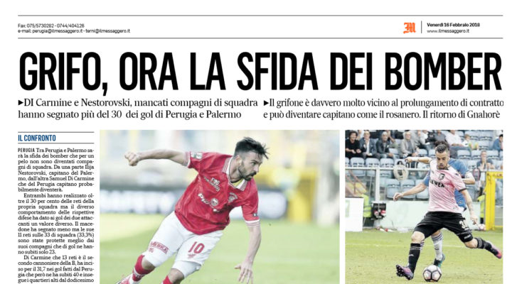 “Tra Perugia e Palermo sarà la sfida dei bomber che per un pelo non sono diventati compagni di squadra. Da una parte Ilija Nestorovski, capitano del Palermo, dall’altra Samuel Di Carmine che del Perugia capitano probabilmente diventerà. Entrambi hanno realizzato oltre il 30 per cento delle reti della propria squadra ma il diverso comportamento delle rispettive difese ha dato ai gol dei due attaccanti un valore diverso. Il macedone ha segnato meno ma le sue 11 reti sulle 33 di squadra (33,3%) sono state protette meglio dai suoi compagni che di gol ne hanno subiti solo 23. Di Carmine che 13 reti è il secondo cannoniere della B, ha inciso per il 31, 7 nei gol fatti dal Perugia che però ne ha subiti 40 e insegue i quartieri alti dal dodicesimo posto. Per Di Carmine che è a secco da due partite (ma il suo gol, poi annullato, lo aveva fatto anche con il Cittadella) «Il Palermo aveva messo sul piatto un’offerta molto importante ha ricordato il dt Goretti -, così com’è stata importante anche la proposta del Parma. Samuel però, ha sempre mostrato la volontà di rimanere a Perugia e per noi Di Carmine è un simbolo, un attaccante straordinario. Stiamo lavorando per il rinnovo»”.