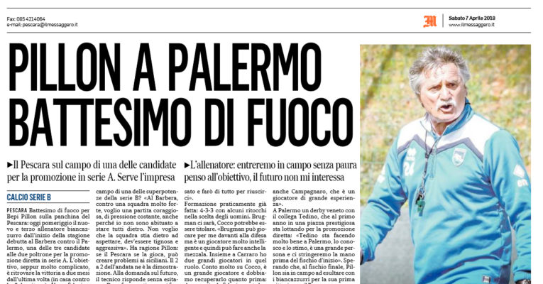 L’edizione odierna de “Il Messaggero” fa il punto della situazione in casa Pescara in vista del match di oggi, in programma alle 15, contro il Palermo: “Battesimo di fuoco per Bepi Pillon sulla panchina del Pescara: oggi pomeriggio il nuovo e terzo allenatore biancazzurro dall’inizio della stagione debutta al Barbera contro il Palermo, una delle tre candidate alle due poltrone per la promozione diretta in serie A. L’obiettivo, seppur molto complicato, è ritrovare la vittoria a due mesi dall’ultima volta (in casa contro la Salernitana). Una sfida improba, contro un’avversaria che oggi ha venti punti di vantaggio sul Delfino e molte più certezze. Il tecnico trevigiano, dopo una settimana di lavoro in cui ha respirato comunque un clima di fiducia e positività attorno a sé e alla squadra, si tuffa nella nuova sfida senza paura e con tutta la sua esperienza: «Le insidie nel campionato di B sono dietro l’angolo – ha detto ieri alla vigilia l’allenatore – . La classifica è corta e credo che bisogna avere equilibrio, senza crearsi delle ansie. Bisognerà pensare di partita in partita».