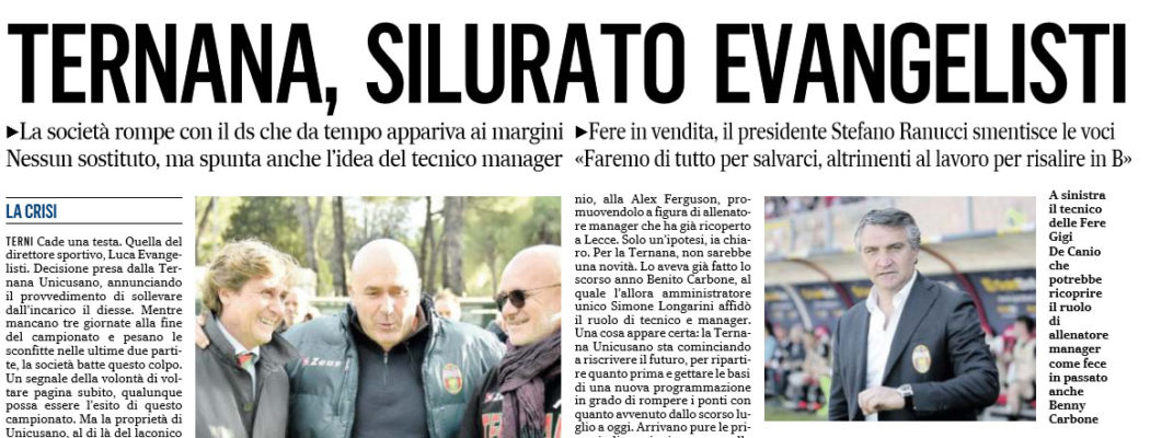 possibilità – scrive, in riferimento anche della passata stagione nel Fondi – di lavorare per due anni con persone importanti». Ringrazia e saluta anche la squadra, i giocatori «che hanno sempre dato il meglio per la maglia e continueranno a farlo fino a fine campionato», lo staff medico, i magazzinieri e tutti coloro che hanno lavorato sia a Fondi che a Terni come dipendenti. Un grazie anche ai tifosi, «per essere stati vicini alla squadra con la loro grande passione». E basta. Con un augurio anche per il futuro: «Sono sicuro che questa società, per le grandi potenzialità che ha, raggiungerà traguardi importanti». Per il dopo Evangelisti, non circolano ancora ipotesi. Ai tifosi piacerebbe un ritorno di Danilo Pagni, ma c’è un’altra soluzione che la dirigenza starebbe valutando in maniera molto attenta, vale a dire quella di mettere tutto in mano a mister Luigi De Canio, alla Alex Ferguson, promuovendolo a figura di allenatore manager che ha già ricoperto a Lecce. Solo un’ipotesi, sia chiaro. Per la Ternana, non sarebbe una novità. Lo aveva già fatto lo scorso anno Benito Carbone, al quale l’allora amministratore unico Simone Longarini affidò il ruolo di tecnico e manager. Una cosa appare certa: la Ternana Unicusano sta cominciando a riscrivere il futuro, per ripartire quanto prima e gettare le basi di una nuova programmazione in grado di rompere i ponti con quanto avvenuto dallo scorso luglio a oggi. Arrivano pure le prime indiscrezioni, come quella secondo la quale sarebbe già a buon punto un accordo con la Virtus Entella per il riscatto di Luca Tremolada, con la Ternana che sarebbe pronta a sborsare 200 mila euro. Cade, per ora, la testa di Evangelisti. Se ne dovranno cadere altre, lo si vedrà da qui a poco. Non mancano nemmeno, però, voci incontrollate in città secondo le quali Unicusano starebbe pensando di mollare e vendere la società. Ranucci, su questo, risponde:«E’ la cosa più assurda che io abbia mai sentito. La società non è in vendita. Anzi, la società continua fino alla fine a fare tutto il possibile perché si raggiunga la salvezza. Ma anche se, disgraziatamente, non ci si riuscisse, si metterebbe immediatamente a testa bassa per recuperare subito questa prestigiosa categoria»”.