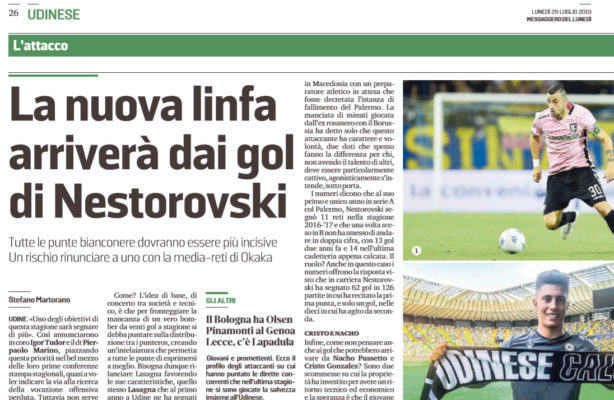 L’edizione odierna del “Messaggero” parla del nuovo attaccante dell’Udinese Ilija Nestorovski. Dopo i pochi gol fatti la scorsa stagione, i bianconeri hanno deciso di affidarsi all’attaccante macedone ex Palermo che ha già esordito contro il Borussia Dortmund. Durante i suoi primi minuti con i friulani, Nestorovski ha dimostrato carattere e volontà. La nuova linfa per l’attacco del tecnico Tudor dunque, è attesa dal nazionale macedone che in carriera ha sempre segnato a valanga. 62 gol in 126 partite da prima punta sono un bel biglietto da visita per un attaccante che ora vuole riconfermarsi in A.