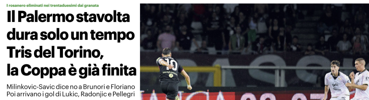 La formazione di Juric è ancora un cantiere aperto, è in cerca di pedine importanti, deve sostituire Belotti, e Cairo è stato pesantemente contestato dai tifosi granata che vorrebbero più investimenti più sostanziosi. Ma anche in queste condizioni è certamente più forte di un Palermo che ieri dopo un tempo di coraggiosa sofferenza, illuminato da una splendida conclusione di Brunori al 9’ s’è sfaldato consentendo ai padroni di casa di dilagare.