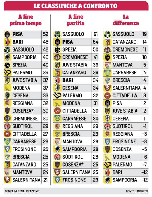 Se il Pisa rimane comunque in zona promozione, la situazione è molto diversa per il Bari. L’undici di Moreno Longo ora divide con il Cesena l’ultimo posto utile per i playoff, ma all’intervallo sarebbe addirittura secondo, in piena lotta per la Serie A. Nei secondi tempi il Bari ha dilapidato ben 12 punti, scendendo da 46 a 34, lo stesso dato negativo della Sampdoria, che passa dal quarto posto (40 punti) al quartultimo (28). Il Sassuolo, invece, è la squadra che ha beneficiato maggiormente dei secondi tempi, guadagnando 19 punti e portandosi al comando della classifica reale.