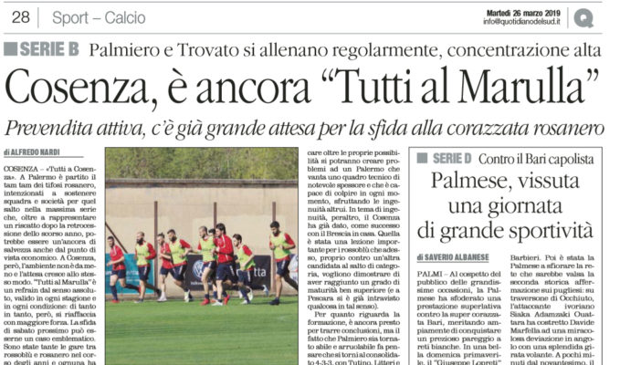 L’edizione odierna de “Il Quotidiano del Sud” si sofferma sulla prossima gara tra Cosenza e Palermo, che vedrà una buona cornice di pubblico da entrambe le parti. I tifosi rosanero si mobilitano per raggiungere la città calabrese e sostenere gli uomini di Stellone. L’attesa cresce anche tra i tifosi di casa, intenzionati a popolare il “Marulla” per la sfida contro i rosanero. Nelle ultime sfide tra rossoblù e rosanero ci sono state tante emozioni a livello tecnico e sugli spalti. Per i ragazzi di Braglia, sarebbe molto importante ottenere punti contro una corazzata del campionato. Ieri, la squadra è tornata a lavorare, nonostante l’assenza degli infortunati Idda e Corsi e dei nazionali Hristov ed Embalo. Allenamento senza problemi per Palmiero e Trovato. L’obiettivo dei lupi è quello di evitare ingenuità come nella sfida contro il Brescia e dimostrare di aver raggiunto un grado di maturità superiore.
