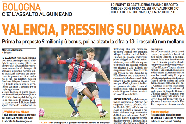“IL VALENCIA rilancia, il Bologna non molla. Anche perchè a Casteldebole sono in arrivo offerte anche per altri giocatori che potrebbero consentire al Bologna di sbloccare il proprio mercato senza sacrificare la pedina più talentuosa in prospettiva. Si accendono le luci dei riflettori pure su IbrahimaMbaye e Lorenzo Crisetig. Il tutto mentre mentre il Valencia continua il pressing per il regista guineano. Vistosi bocciare la prima proposta da 9 milioni più bonus (fino a 15 milioni di euro), il club spagnolo ha rilanciato: 13 milioni di euro tutto incluso. Il Bologna ha risposto chiedendo 16 milioni di euro più bonus fino a 20 e per ora il Valencia non pare intenzionato a rilanciare, con la speranza che la vicenda del deferimento annunciato dalla federazione italiana e la possibile squalifica che pende sulla testa del ragazzo possa portare le squadre italiane a un calo di interesse sul giocatore e il Bologna ad abbassare le pretese. Anche perché il Napoli, per ora, non è andato oltre l’offerta di 6 milioni più Mirko Valdifiori (30 anni). Il regista ora allacorte di Sarri gradirebbe la destinazione rossoblù più di quella bianconera dell’Udinese, altra squadra a cui è stato proposto (insieme a Zuniga) dal Napoli per arrivare a Zielinski. Ma per ora, il Bologna non molla e attende notizie dalla Germania, dove riferiscono che il Wolfsburg stia per presentare un’offerta formale per Ibrahima Mbaye. La cifra che il club della Bundesliga è pronta a mettere sul piatto si aggira tra i 2,5 e i 3 milioni di euro, ovvero all’incirca quanto sborsato dal Bologna (prestito con riscatto a 2,75 milioni) per strapparlo all’Inter. Tenuto conto che Mbaye ha uno stipendio da 800mila euro netti a stagione e il club rossoblù ha la necessità di abbassare il monte ingaggi, e che in rosa pure Krafth, Rossettini e Ferrari possono ricoprire il ruolo di terzino destro, non è da escludere che la dirigenza faccia un pensierino a concludere l’affare. ANCHE PERCHÉ quel denaro potrebbe dirottarlo al Palermo per strappare l’esterno offensivo Carlos Embalo (21), nell’ultima stagione in prestito a Brescia e più volte visionato dagli osservatori del Bologna, valutato tra i 2 e i 2,5 milioni di euro. L’affare potrebbe decollare perché il Bologna ha la necessità di affiancare a Rizzo e Mounier (quest’ultimo in lista cessioni) almeno altri due esterni d’attacco prima della partenza per il ritiro di Castelrotto (10 luglio), per consentire a Donadoni di lavorare sui nuovi equilibri offensivi e di squadra fin dal principio, considerato che proprio l’attacco è stato il tallone d’Achille dell’ultima stagione. Poi c’è Giaccherini, che in caso di riscatto, arriverebbe a lavori iniziati (dopo Europei e vacanze), mentre Falco non dovrebbe rientrare: il Cesena è pronto a chiedere il prolungamento del prestito e sull’ex di Lecce e Trapani si muove pure il Crotone, che ha chiesto notizie anche di Archimede Morleo e Lorenzo Crisetig. E’ proprio in Calabria che il regista di scuola Inter si mise in mostra agli occhi del mondo del calcio tre anni fa e il Crotone vorrebbe rilanciarlo. Ma sul centrocampista ci sono gli occhi pure di Empoli, Chievo e Udinese: perché l’eventuale partenza di Crisetig vada a buon fine, servirà l’ok dell’Inter, visto che il giocatore è arrivato sotto le Due Torri in prestito biennale con obbligo di riscatto e dal momento che l’Inter è fresca di cambio di proprietà servirà tempo per parlarne. Quando accadrà, nerazzurri e rossoblù dovrebbero approfittarne per parlare pure di Jonathan Biabiany (28) e Assane Gnoukouri (19)”. Questo quanto si legge sull’edizione odierna de “Il Resto del Carlino”.