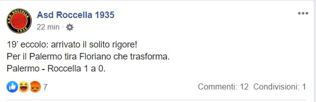 Il match tra Palermo e Roccella, gara valida per la 20^ giornata del campionato di Serie D, è stato sbloccato dal rigore procurato e poi trasformato da Floriano. Il Roccella, tramite la propria pagina Facebook, ironizza su questo rigore e scrive “19’ eccolo: arrivato il solito rigore!”. In alto il post del club calabrese.