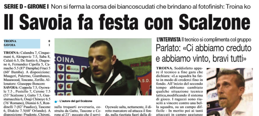 L’edizione odierna de “Il Roma” celebra l’impresa del Savoia che in trasferta non sbaglia e allo scadere beffa il Troina. Continua così la striscia di risultati utili dei bianchi che sembra essere infinita, dato che dura da ben 11 gare consecutive. Con la partita ferma sullo 0-0, è al 47’ del secondo tempo che Scalzone sblocca finalmente il match e regala la vittoria ai suoi con un gol imparabile per l’estremo difensore locale. Soddisfatto appare il tecnico a fine gara che dichiara: «La squadra ha fatto in modo di crederci fino in fondo. All’inizio del secondo tempo abbiamo cambiato qualche situazione tecnico tattica,modificando il sistema di gioco. I ragazzi sono riusciti a vincere contro una bella squadra, su un campo difficile. Ovviamente dipende sempre da come si mette la partita. Ieri abbiamo fatto un buon possesso nel primo tempo ma c’erano pochi spazi. Nel secondo, invece, abbiamo alzato i ritmi e portato tanti calciatori in avanti: la bravura dei ragazzi, alla fine, li ha premiati». Il tecnico, su una domanda sul prossimo match della squadra, afferma: «Godiamoci queste dodici ore e poi penseremo alla prossima partita». Infine, anche l’autore della rete decisiva, Scalzone, ha commentato la partita risolta ancora una volta allo scadere: «Siamo contentissimi. È stata una partita combattuta e, fortunatamente, è stata decisa nuovamente al 90’. Siamo una squadra che non molla mai e che ci crede fino alla fine. Abbiamo ottenuto una vittoria fondamentale, contro un’ottima squadra che si è chiusa e che ci ha messo in difficoltà. Volevamo vincerla e c’è stato un assedio nel finale: la cosa importante è stata portarla a casa».