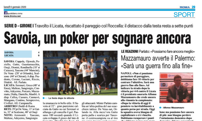 L’edizione odierna de “Il Roma” esalta la vittoria del Savoia sul Licata, riportando le dichiarazioni forti del presidente onorario Alfonso Mazzamauro. Un 4-0 pesante quello inflitto dagli oplontini. «Non ci possiamo permettere di pareggiare, dobbiamo fare 10 vittorie per centrare l’obiettivo. Sarà una guerra fino alla fine. Dopo la vittoria di oggi il pensiero va inevitabilmente a quanto perso per strada. Oggi la squadra aveva bisogno di capitalizzare e ci è riuscita. Dobbiamo recuperare i punti che abbiamo perso: non spero nelle disgrazie altrui, guardiamo in casa nostra e spero che il match contro il Roccella sia stato un fatto a sé stante. Messina? È tra le quattro squadre più forti del campionato, però andremo lì per vincere. Lo segue l’attaccante De Vena: «Qui come all’Avellino? Lo spero perché potrebbe essere un bel successo recuperare dal meno sette in classifica. L’anno scorso non giocammo contro il Palermo ed eravamo a meno dieci, ma ci possiamo ancora credere».