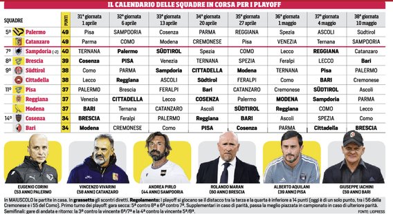 Batticuore serie A. A otto giornate dalla fine della stagione regolare, i giochi restano apertissimi e offrono l’ennesima opportunità di valorizzare quanto fatto sinora. Tutti in gioco, insomma, ma guai a dare qualcosa per scontato o irraggiungibile. Anche perché se la parte alta della classifica sembra aver già indirizzato la volata di primavera verso il traguardo, nel perimetro playoff può succedere di tutto e anche chi ne è ora fuori potrebbe sperare e osare. Se si profila una corsa a quattro per la conquista delle prime due posizioni che portano direttamente in A, con il Parma grandissimo favorito rispetto a Venezia, Cremonese e Como, le 9 lunghezze che attualmente ci sono tra il Palermo e il Catanzaro – che si dividono il 5º posto a quota 49 – e la Sampdoria, 7ª a 40, fanno immaginare che siano solo due le postazioni disponibili. Ovvero la 7ª e l’8ª posizione. Ma per ambire a questo traguardo potrebbe profilarsi una bagarre.