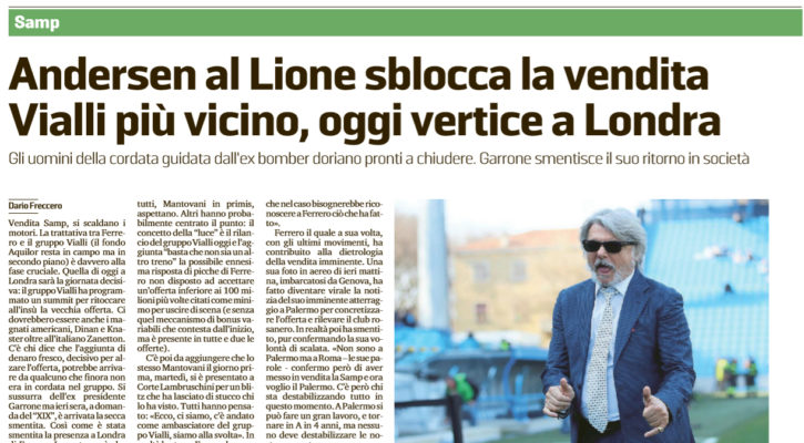 L’edizione odierna de “Il Secolo XIX” ha analizzato la trattativa che porterà alla cessione della Sampdoria. Il quotidiano scrive che la trattativa tra Ferrero e il gruppo Vialli è davvero alla fase cruciale. In giornata si terrà un summit in quel di Londra in cui il gruppo Vialli ritoccherà l’offerta presentata in precedenza. Presenti all’incontro ci saranno anche i magnati americani Dinan e Knaster oltre a Zanetton. Il quotidiano inoltre scrive: “C’è chi dice che l’aggiunta di denaro fresco, decisivo per alzare l’offerta, potrebbe arrivare da qualcuno che finora non era in cordata nel gruppo. Si sussurra dell’ex presidente Garrone ma ieri sera, a domanda del “XIX”, è arrivata la secca smentita. Così come è stata smentita la presenza a Londra di Ferrero. La sostanza è che tutti sono in attesa, ma cresce l’impressione che si possa chiudere molto presto. Ci sono tanti altri dettagli che svelano che l’acqua bolle. Uno è che il mercato doriano in entrata è bloccato. Un blocco momentaneo ma che per esempio la settimana scorsa non c’era, segno che Ferrero ha congelato tutto in attesa degli sviluppi sulla vendita. […]”.