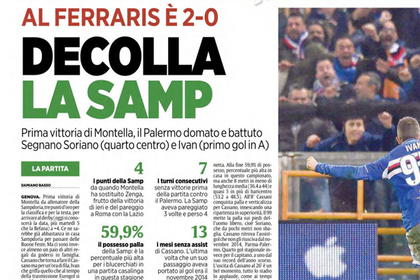 “Prima vittoria per Montella, il Palermo domato e battuto”. Titola così l’edizione odierna de “Il Secolo XIX” in merito alla vittoria della Sampdoria sul Palermo e analizza così il match: “Prima vittoria di Montella da allenatore della Sampdoria, tre punti d’oro per la classifica e per la testa, per arrivare al derby a +4. Ma ci sono invece almeno un paio di altri regali da godersi in famiglia. Cassano che torna a fare il Cassano ma per un’ora di fila, Ivan che griffa un eurogol. La Sampdoria ha pesato di più tatticamente rispetto al Palermo e baricentro ed equilibri si spostano dalla sua parte con il passare dei minuti, fino a sfociare quell’ultimo quarto d’ora del primo tempo in un coinvolgente arrembaggio. […]”