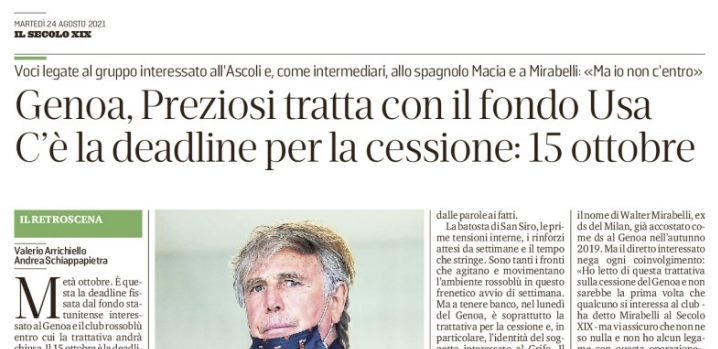 Il Secolo XIX: “Genoa, Preziosi tratta col fondo USA. Il fondo vuole anche il 30% di un altro club?”