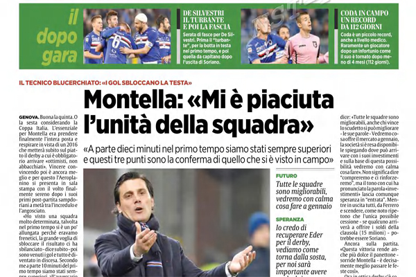L’edizione odierna de “Il Secolo XIX” celebra così la prima vittoria del nuovo tecnico Vincenzo Montella, riportando le sue parole a fine gara. Ecco quanto si legge: “Buona la quinta, o la sesta considerando la Coppa Italia. L’essenziale per Montella era prendere finalmente l’intera posta in palio e respirare in vista del 2016 che metterà subito sul piatto il derby a cui bisogna arrivare «Ottimisti, non abbacchiati». Vincere convincendo poi è ancora meglio, per questo l’aeroplanino si presenta in sala stampa con il volto finalmente sereno dopo i suoi primi post-partita sampdoriani a metà tra l’incredulo e l’angosciato: «Ho visto la mia squadra determinata, non sempre compatta ed ogni tanto un po’ frenetica. Questa voglia di sbloccare la partita, però, ci ha portato ad essere un po’ frenetici e la frenesia ti porta ad essere un po’ impreciso. Siamo sempre stati superiori all’avversario, tranne che per dieci minuti nel primo tempo, e abbiamo meritato la vittoria. Dei miei mi è piaciuta di più l’unione di squadra che ci porterà più punti a prescindere dalla tattica e dai moduli che di volta in volta useremo, quando vai in campo e giochi come squadra e giochi in modo corale, la risposta c’è sempre»”.